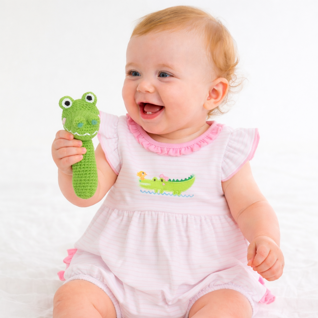 Shake, rattle, and smile—this charming Alligator Crochet Stick Rattle is designed to delight from the very first grasp. Lovingly hand-crocheted with care, it features a playful alligator face and a softly textured handle that’s easy for little hands to hold. The gently bumpy crochet stitches encourage sensory exploration while adding timeless charm.
