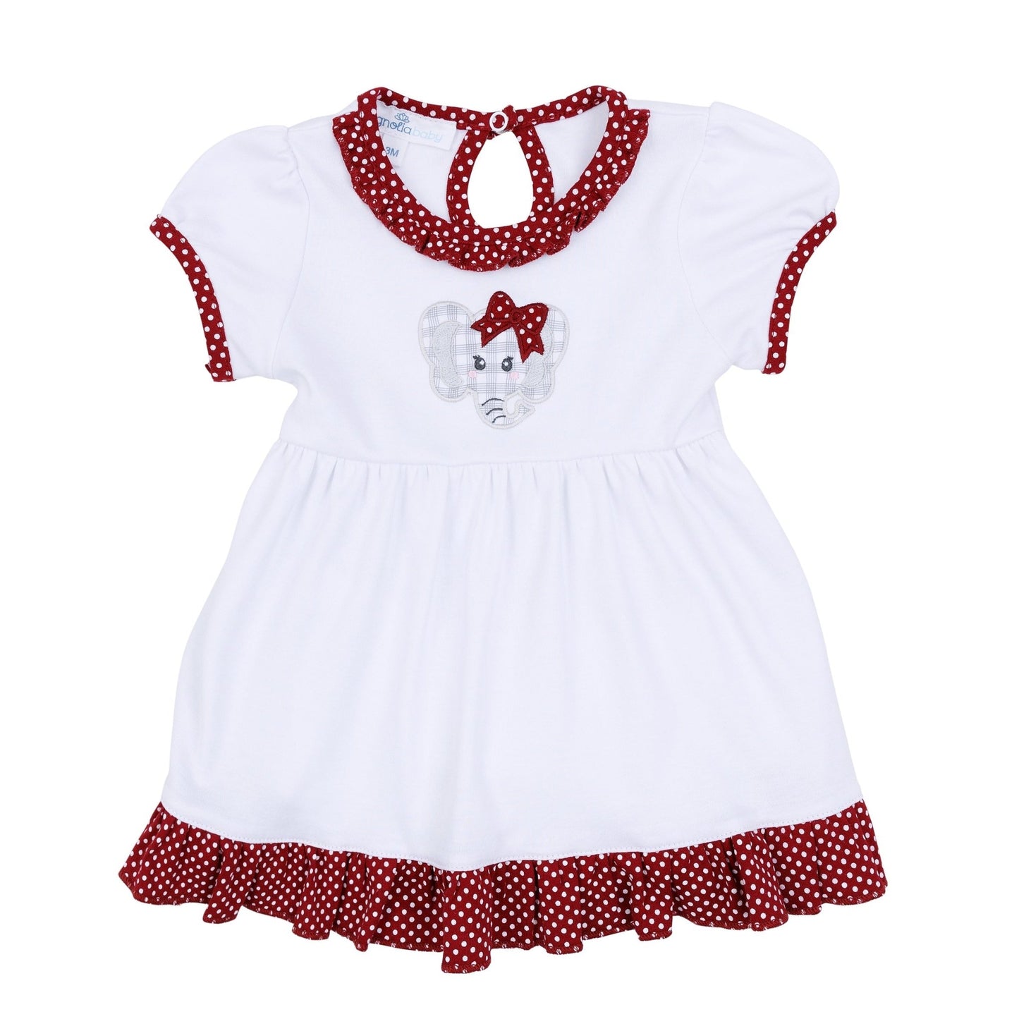 A beautiful ruffled dress for your little princess. It features a sweet elephant applique with a red bow and red polka dot trim. Perfect for watching the football game in comfort!