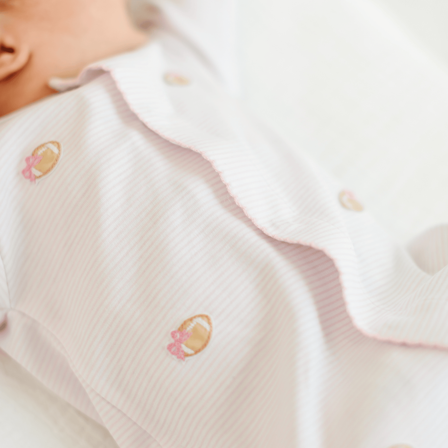 Score big on sweetness with our adorable Touchdown Cutie Embroidered Ruffle Footie! Crafted from luxurious Pima Cotton, this charming pink footie features delicate ruffles and a hand-embroidered American football with a pretty bow, perfect for your little one's dream team.