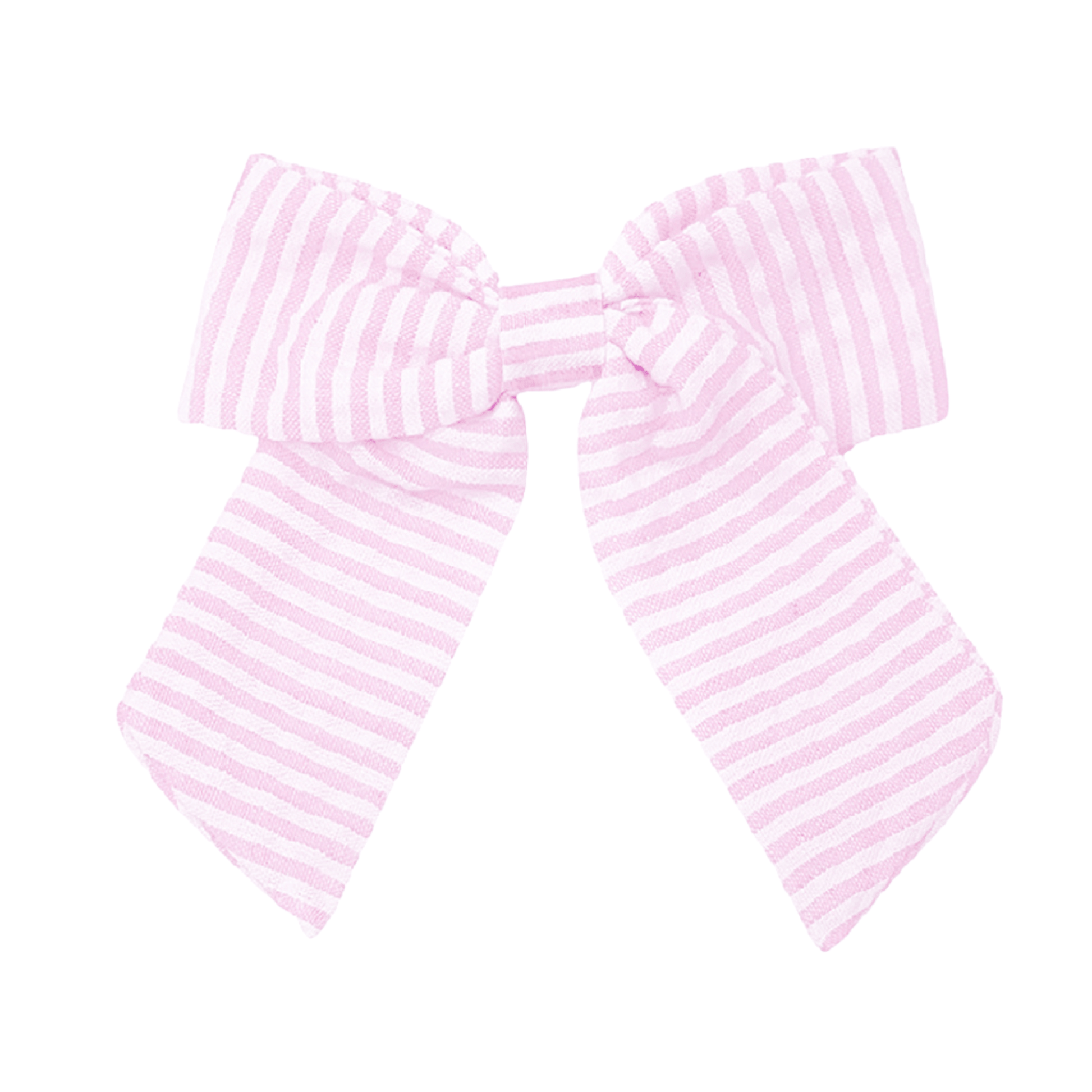 Add a touch of playful charm to her look with this Pink Seersucker Hair Bow. Crafted from soft, breathable seersucker fabric, it offers a light texture that stays comfortably in place all day. Its delicate gathers and cheerful pink hue make it the perfect accessory to brighten up any outfit—from casual days to special occasions. Easy to clip in and remove, this bow blends timeless style with a fun, fresh spirit, making every moment a little sweeter.