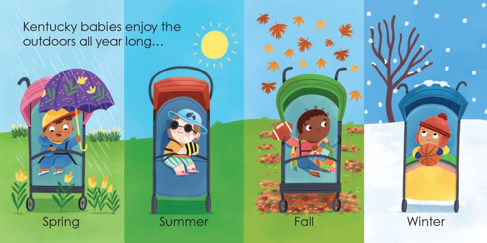 Meet the Kentucky babies as they explore their fun home state in this lively board book! Filled with colorful pictures and playful text, it introduces little ones to Kentucky’s landmarks and culture. With extra activities in the back, parents and kids can enjoy learning together again and again. Perfect for babies aged 0-4, it makes a great gift for new families and storytime adventures.